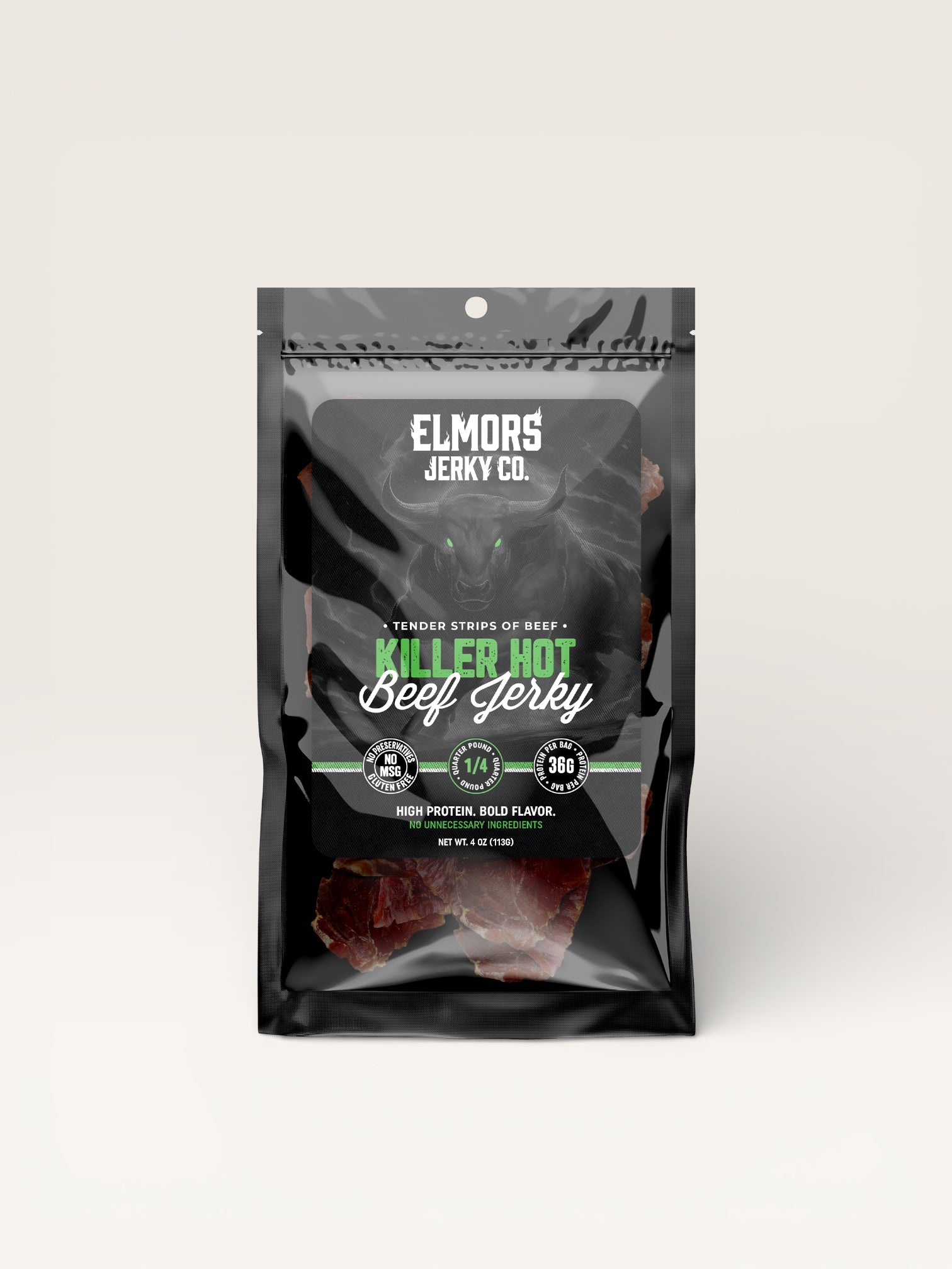 Premium handcrafted beef jerky with bold killer hot flavor. Gluten-free, no MSG, and no preservatives. 36g protein per 4oz (¼ lb beef) and 72g per 8oz.